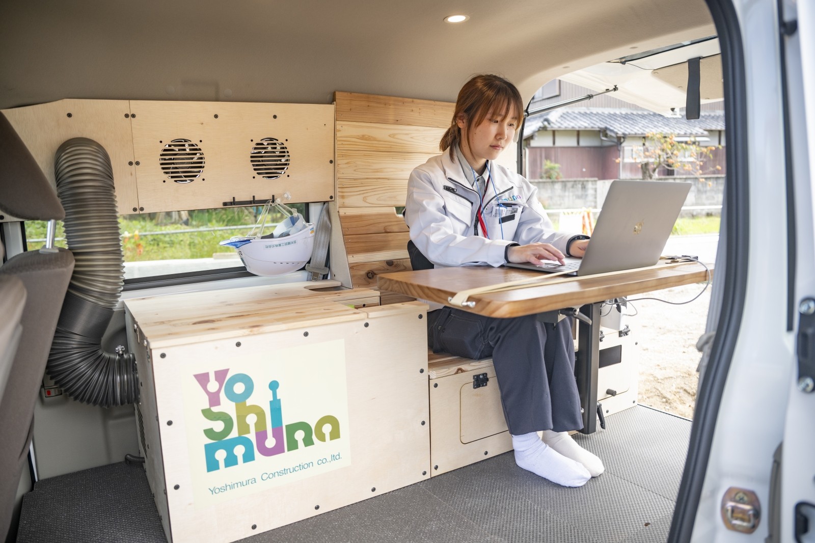 移動・休憩・事務作業を1台で完結させることで、現場と本社の移動ロスを削減し、残業時間の短縮を図る狙いがある。