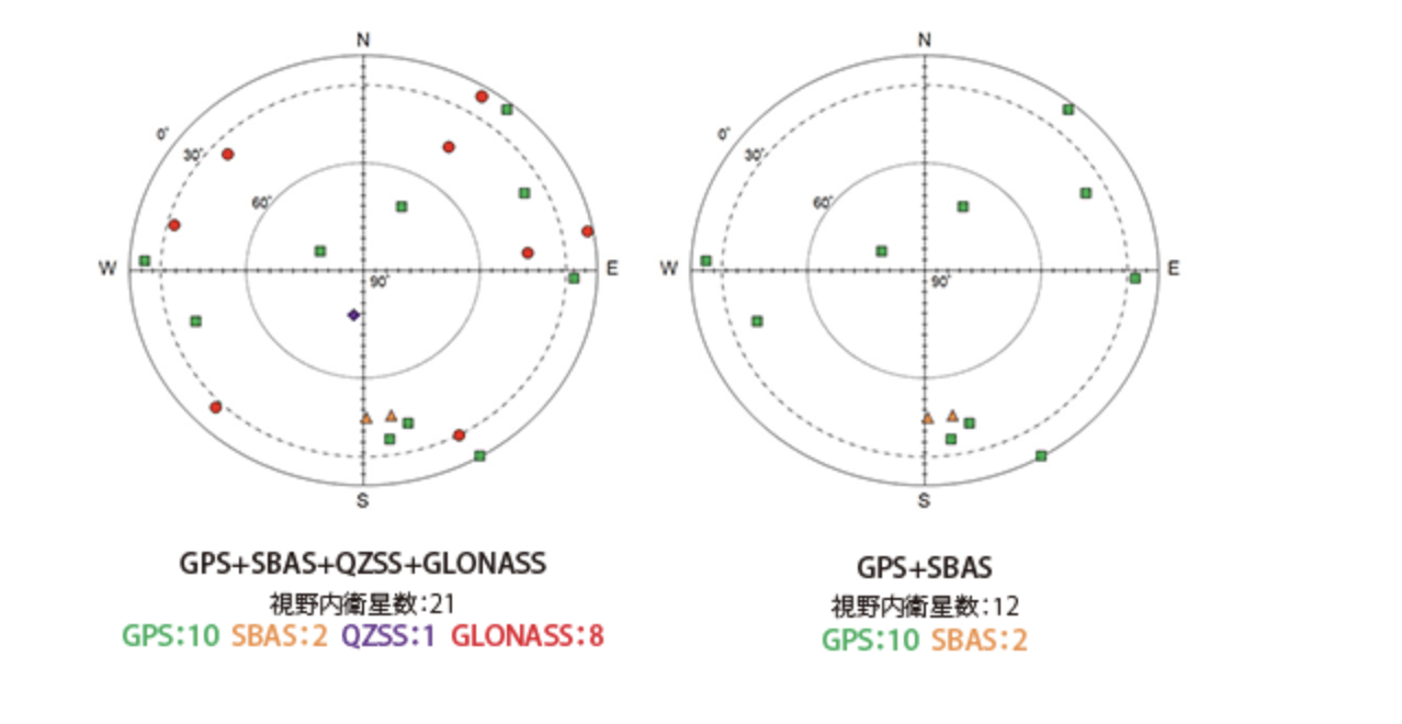 - QZSS(日本・みちびき): 日本の真上(天頂)付近に滞在するため、ビル影や山間部でも受信しやすい。
