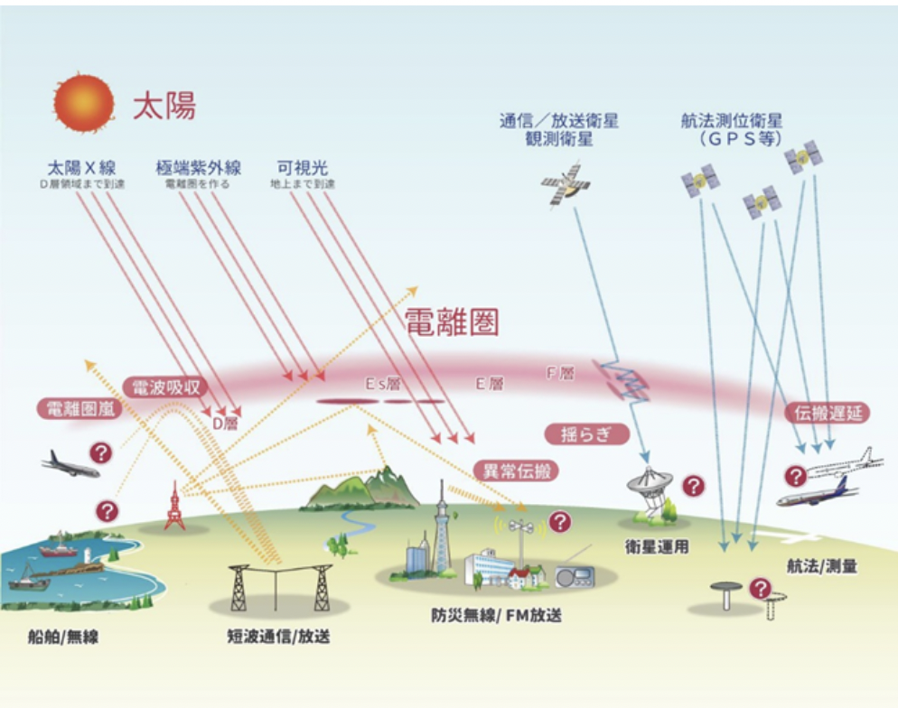 地上から高度約50km~1000kmの大気上層には、紫外線などのエネルギーによって分子がイオン化(プラズマ化)した「電離圏」という層が存在する。