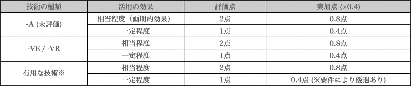 つまり、-VE技術を選ぶことは、少ない労力で着実に「0.8点」の実加点を積み上げるための近道なのだ。