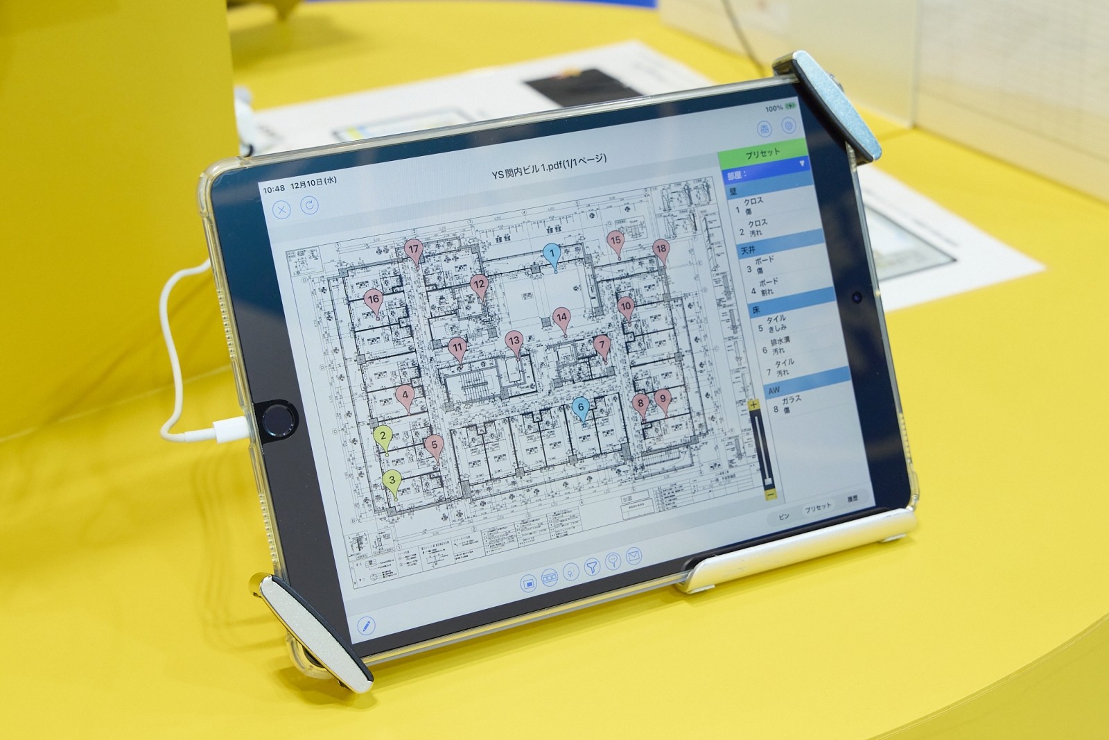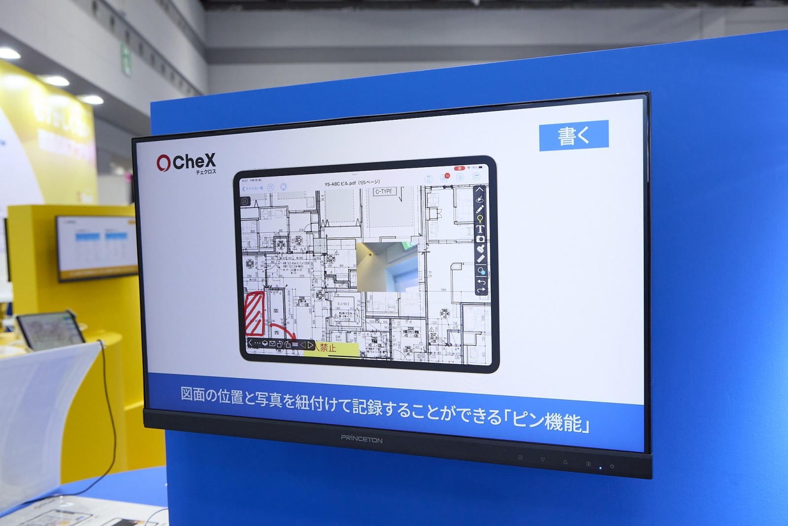 配筋検査や仕上げ検査の劇的な効率化を実現するツール。iPad上の図面に、傷や汚れなどの指摘箇所を「ピン」として打ち込み、写真を撮影するだけで検査記録が完了する。