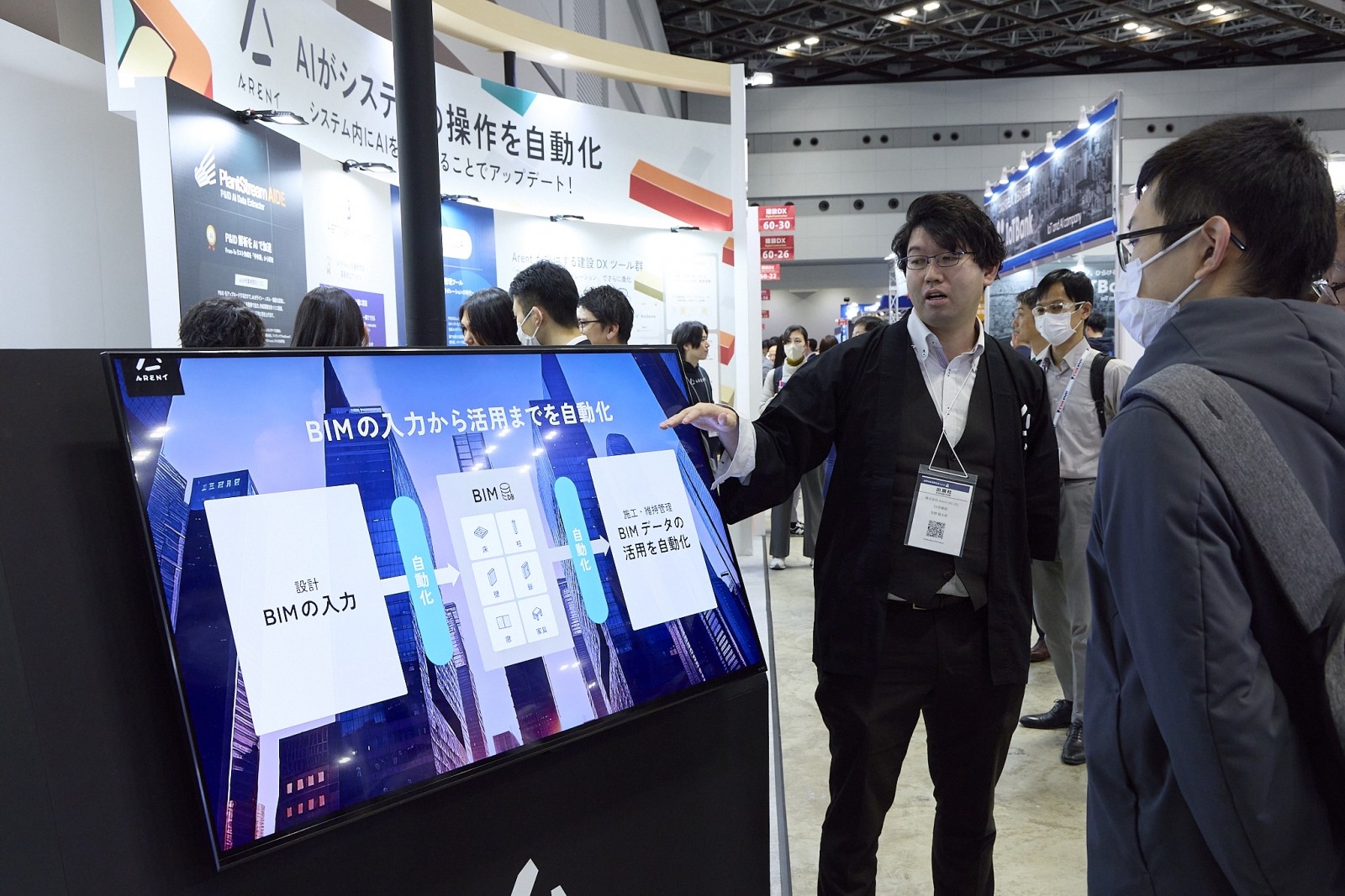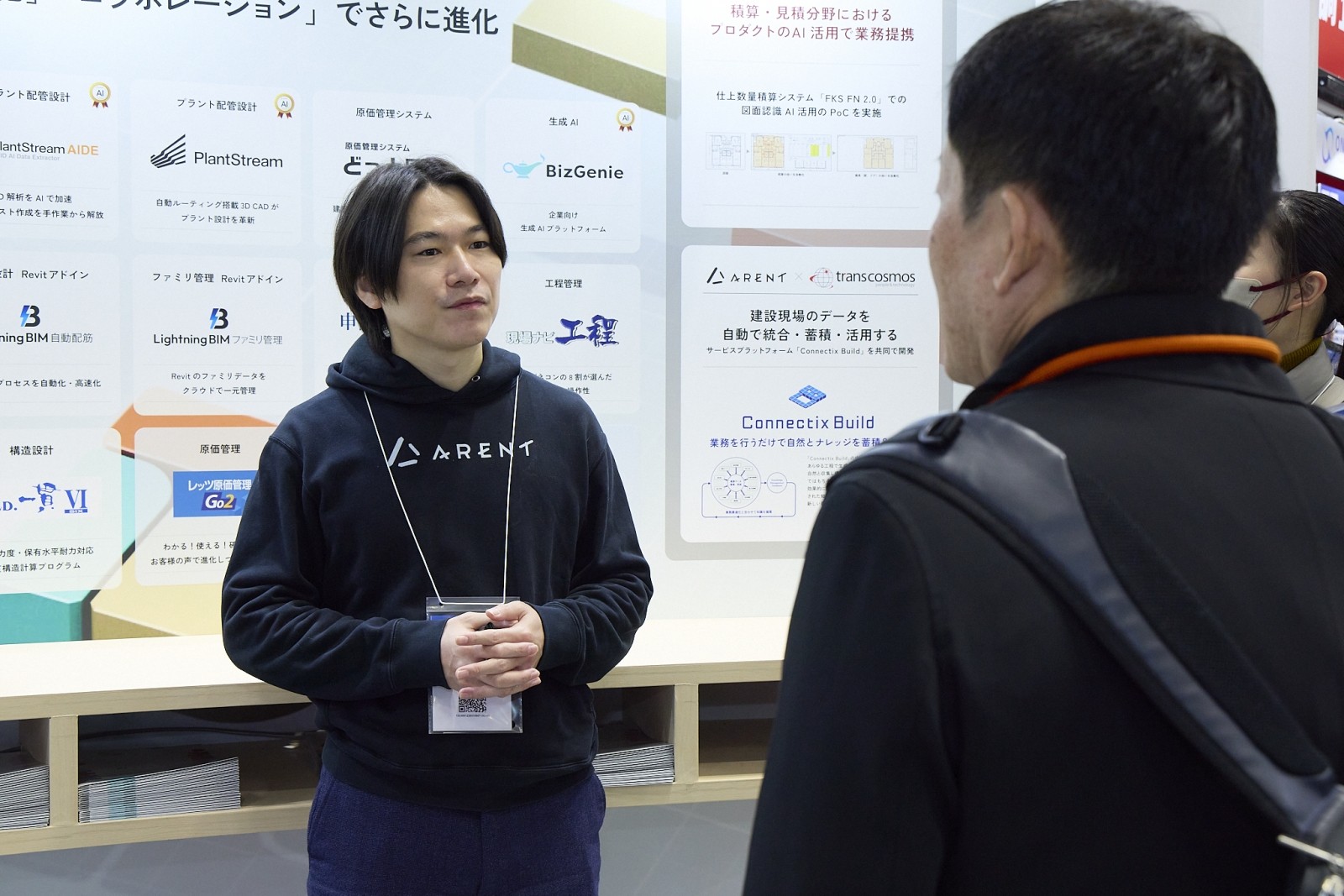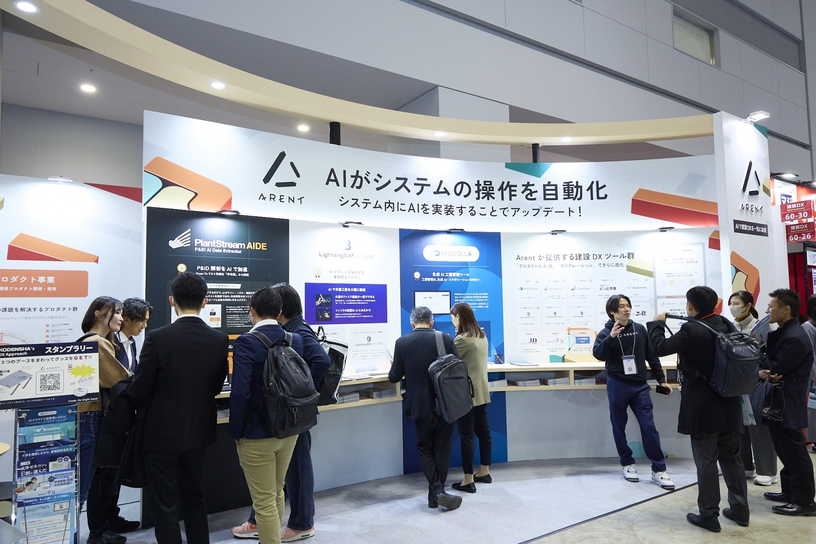建設業界の深い課題解決を掲げるArentのブースでは、高度な数学力とAIを掛け合わせ、熟練技術者のノウハウをシステム化する「建設DXツール群」が展開された。