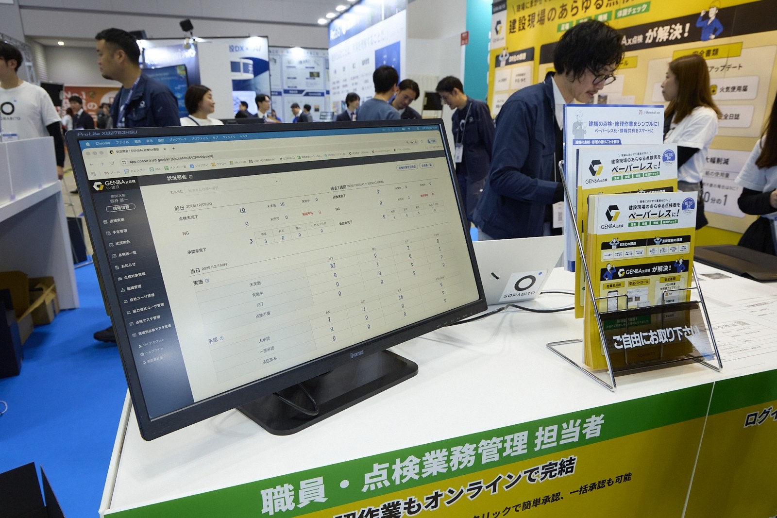 建機レンタルDXで知られるSORABITOが展示したのが、現場のあらゆる点検業務をペーパーレス化する「GENBAx点検」だ。