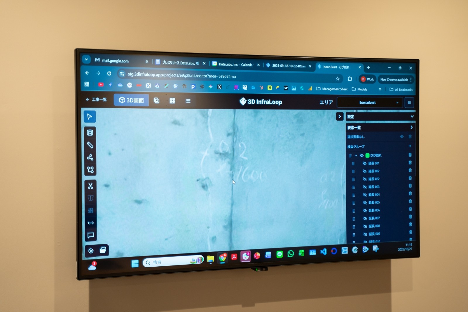 (写真:3Dメッシュデータについて説明する田尻氏)田尻:リリース時点では、基本的なひび割れのパターンは自動検出でき、あらゆる損傷の検出に対応できているほどではありませんが、それでも診断の負担を大きく減らせるようなクオリティだと言えます。