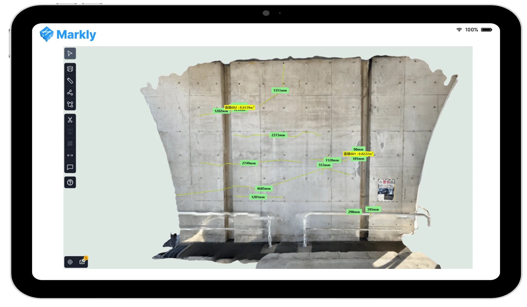 田尻:「Markly」は橋脚やトンネルを、スマートフォンやタブレット、地上型レーザースキャナやSLAM等で撮影し、3次元的に捉えることで対象物全体のひび割れ分布の把握を効率化します。