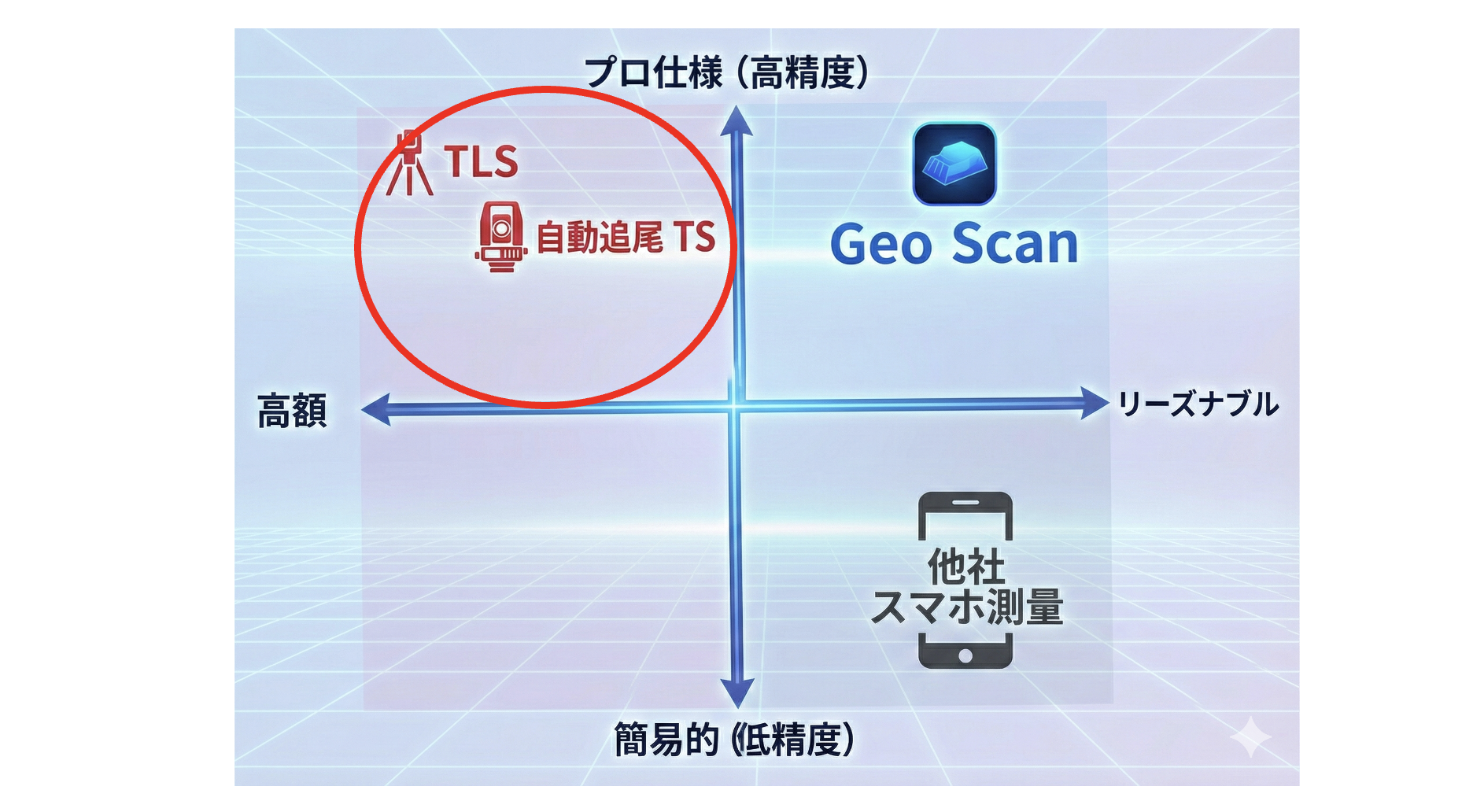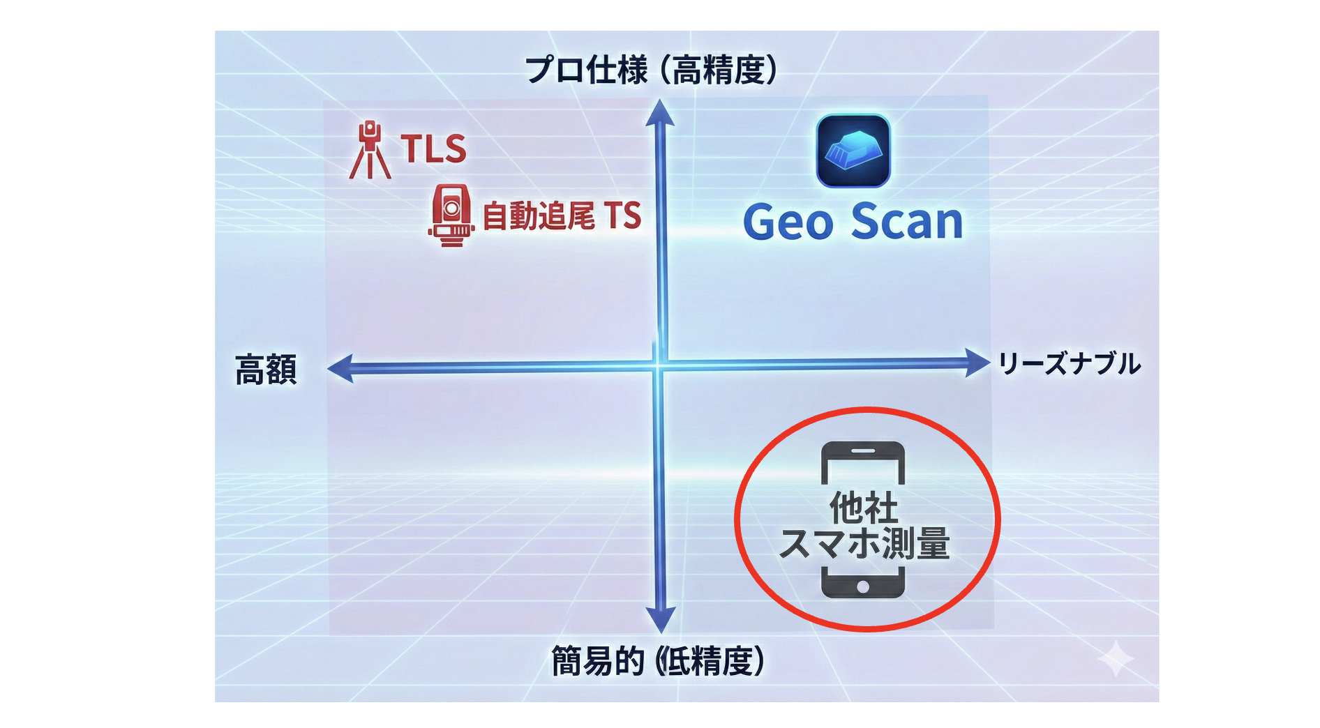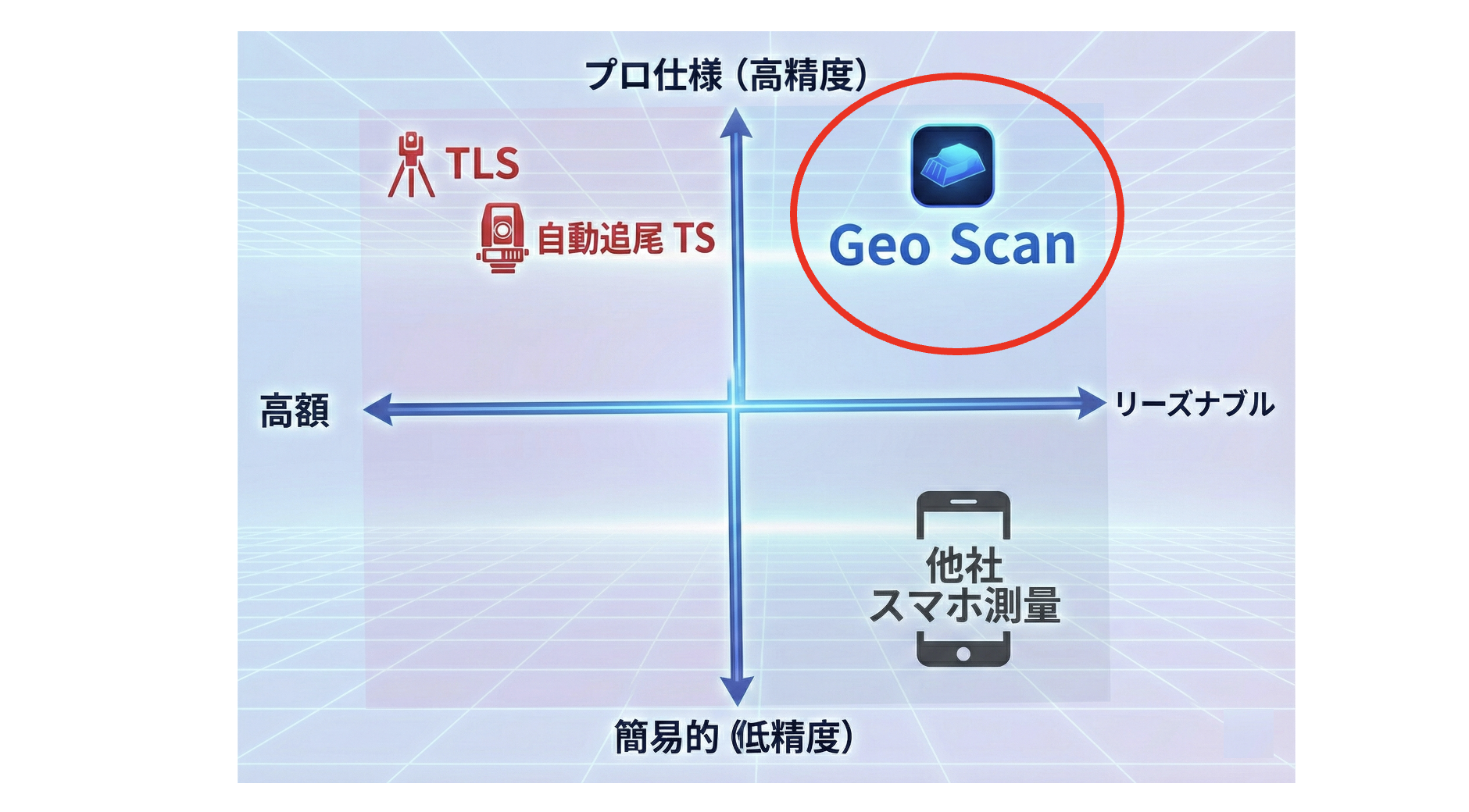 実は、Geo Scanは「プロフェッショナル(高精度)×リーズナブル(低コスト)」という右上の象限に位置している。