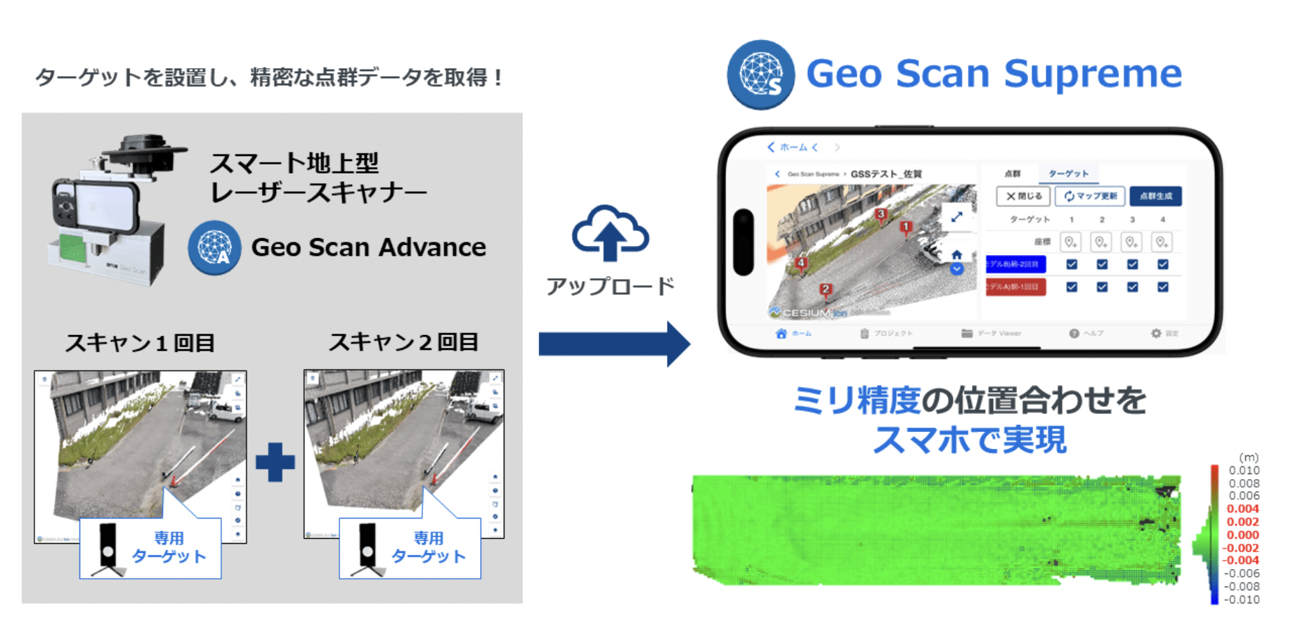 しかし、Geo Scan独自の技術運用によって、この±2センチにばらけていた計測結果が±5ミリの範囲内に収まるようになり、統計処理によりミリ精度を達成した。