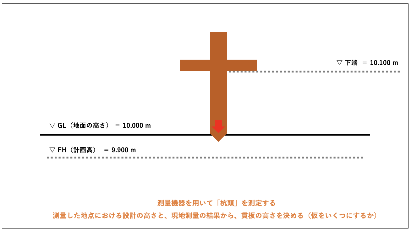 「仮」とは、貫板の下端から設計高さまでの距離のことで、重機オペレーターが仕上がり面を確認するための基準値となる。