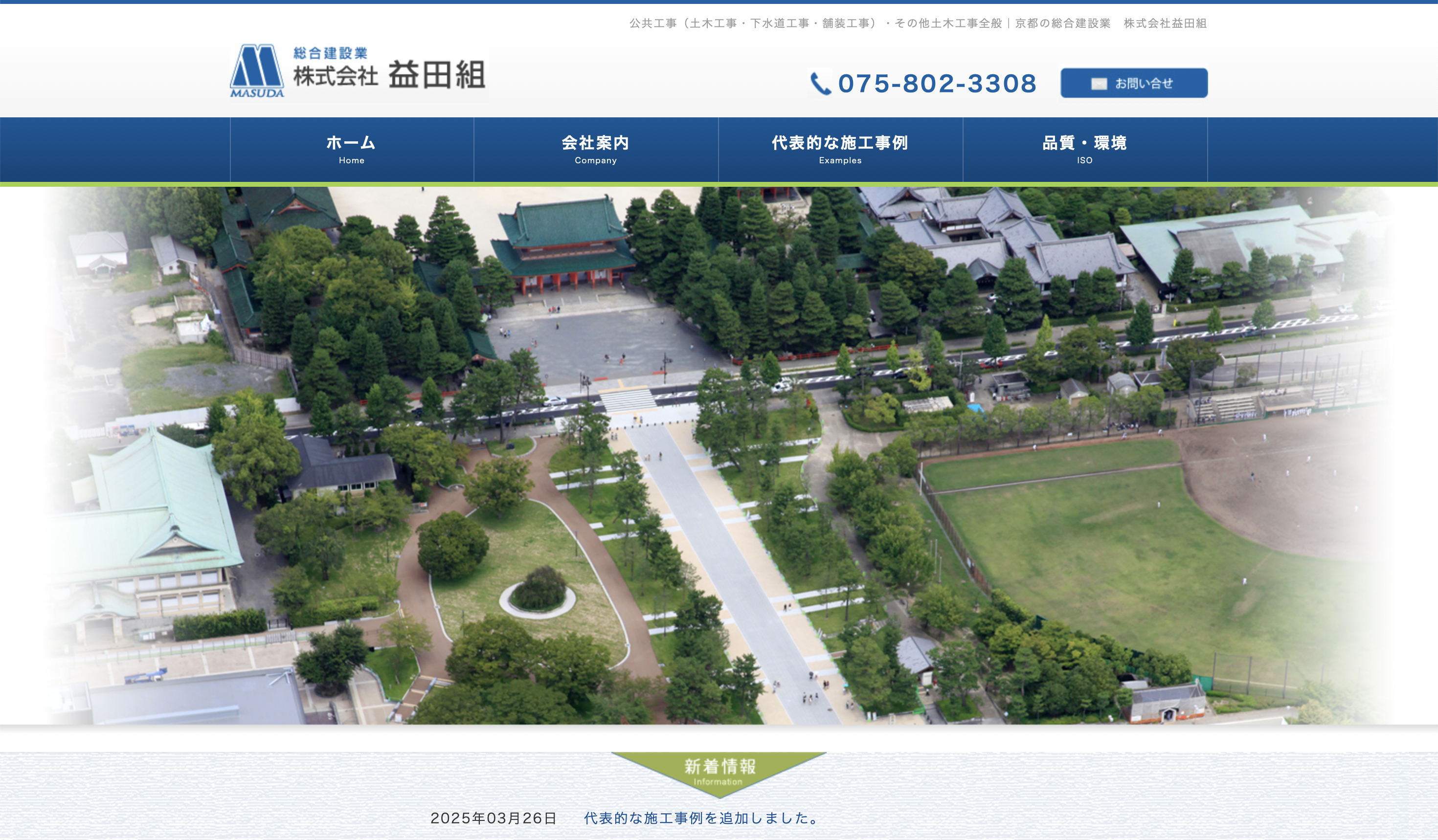 近年の実績としては、東本願寺前市民緑地整備工事や鴨川公園公共都市公園施設整備工事などがあり、暮らしを支えるインフラ工事に加え、景観や歴史遺産を守る工事も目立っている。