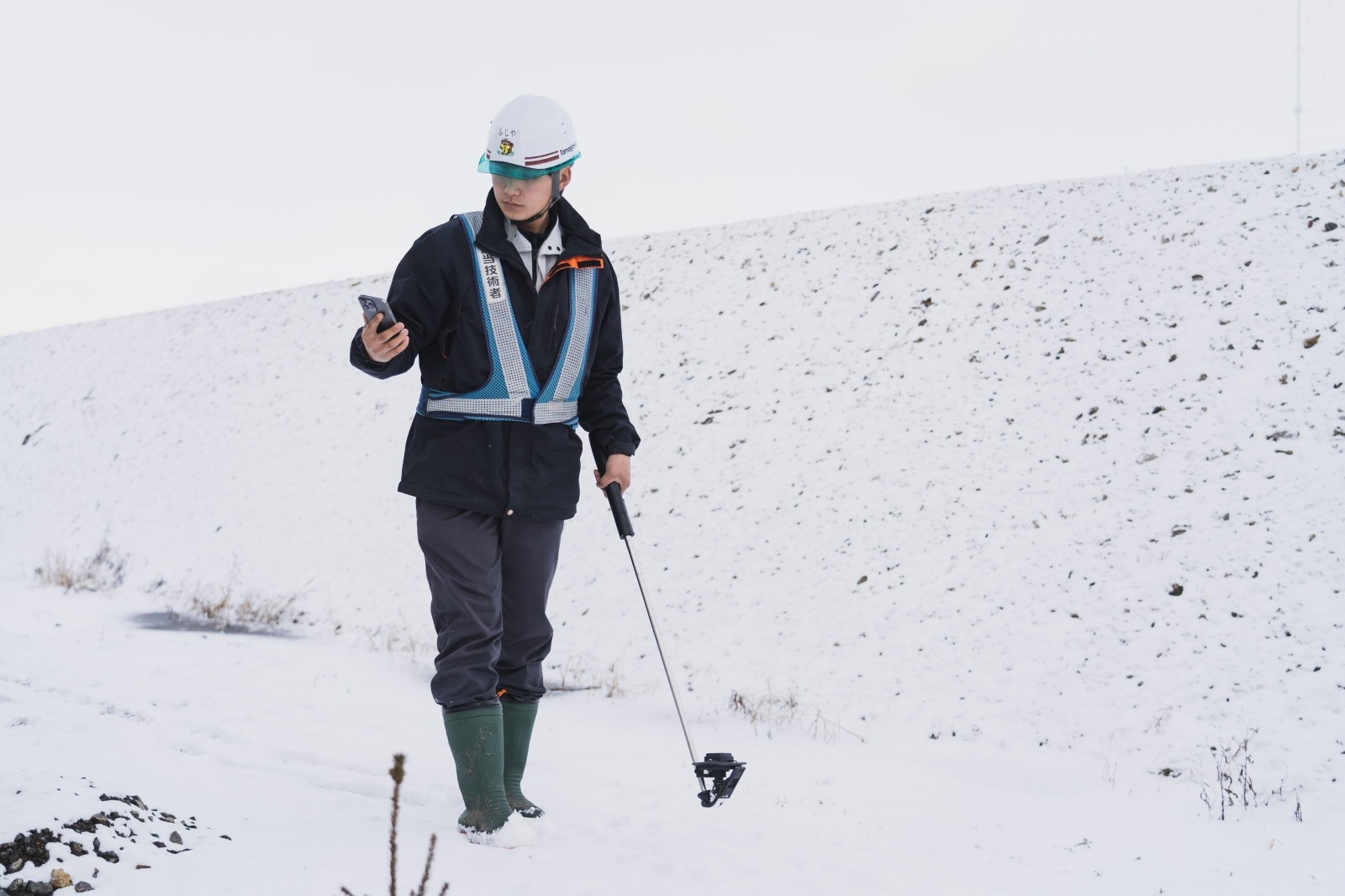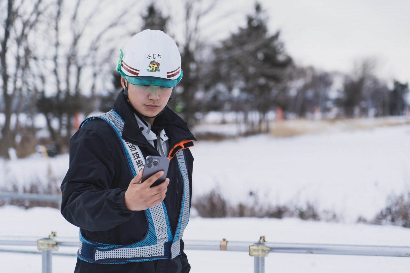 (Geo Scanで高精度1人スマホ測量をしている様子/北海道玉川組/デジコン撮影)