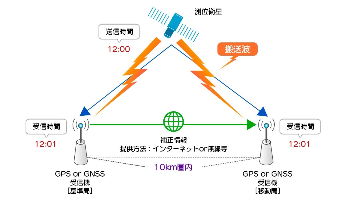 基準局は自身の正確な位置と、観測した衛星信号の位相データ(搬送波位相)を元に補正データを生成し、無線またはインターネット経由で移動局に送信する。