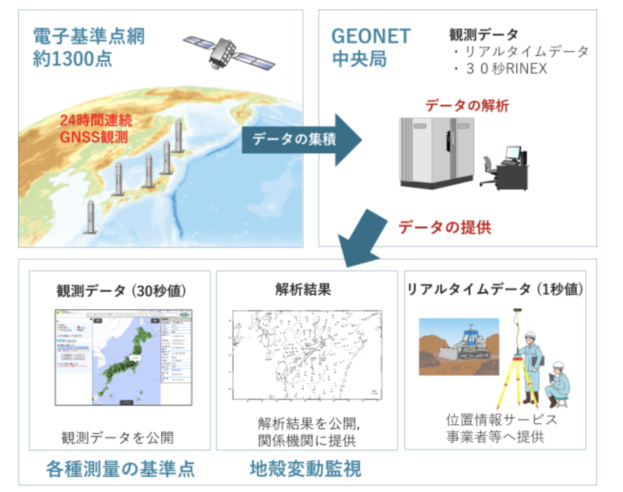 国土地理院は全国約1,300箇所に展開する「電子基準点(GEONET)」を運用し、その観測データがCLAS補強情報の計算に活用されている。