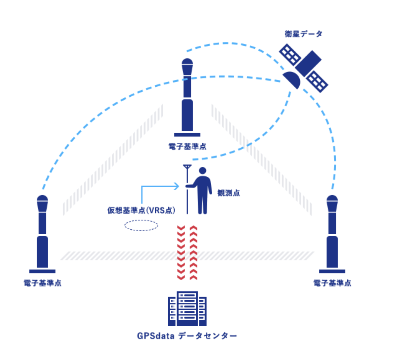複数の基準局をネットワークで連結し、受信機側への補正データ配信によってセンチメータ単位での位置決定を可能にする仕組みである。