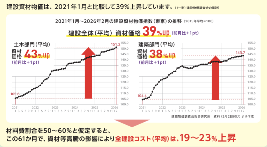 日建連が公表した最新の建設資材データ(2026年3月版)によると、建設資材物価は2021年1月と比較して建設全体平均で39%上昇している。