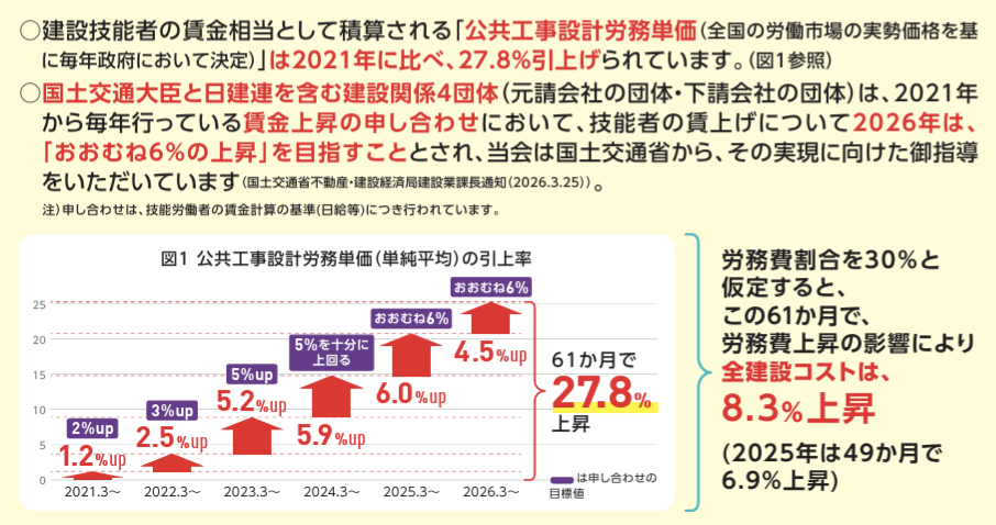 公共工事設計労務単価は2021年比で27.8%引き上げ。2026年はさらに「おおむね6%上昇」を目指す