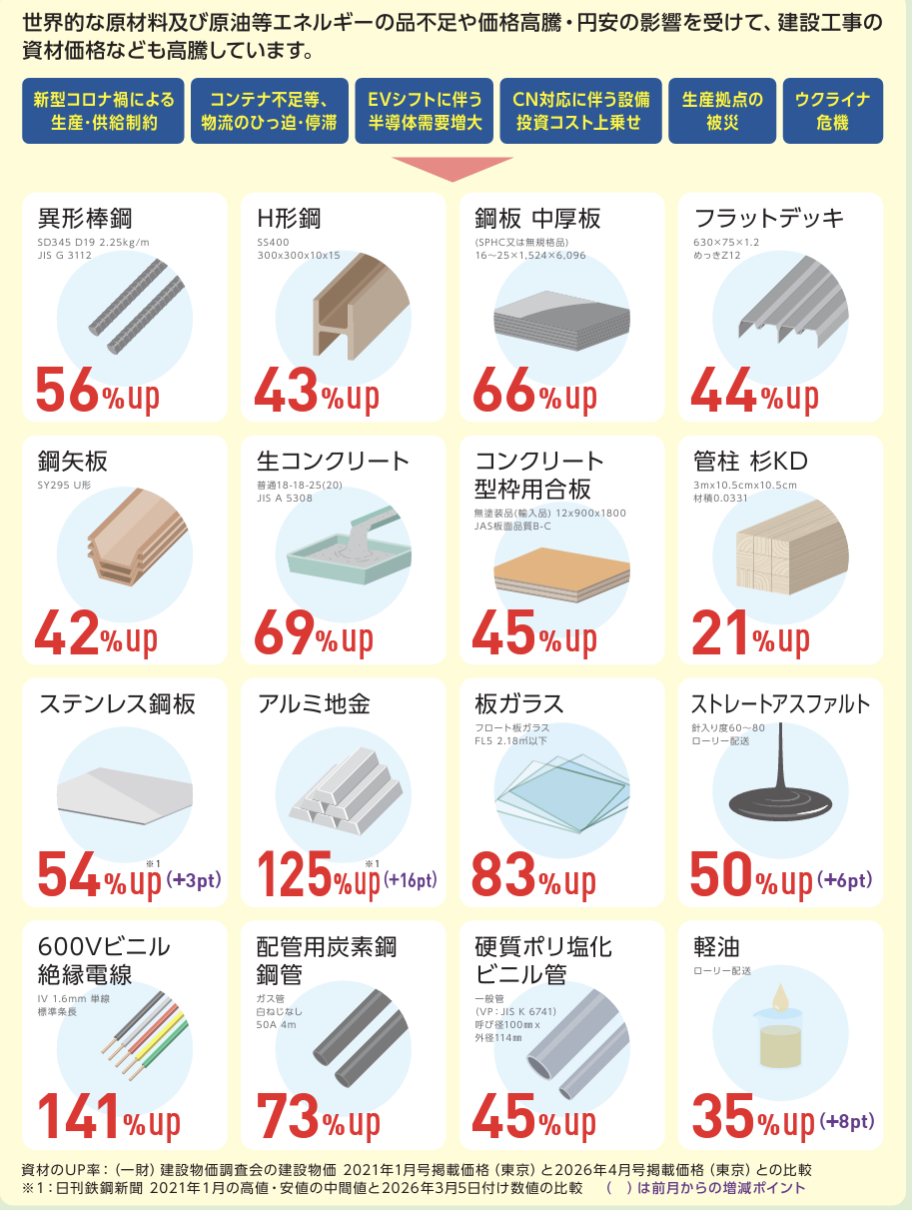 建設資材物価は2021年1月比で平均39%上昇。全建設コストは最大32%増に