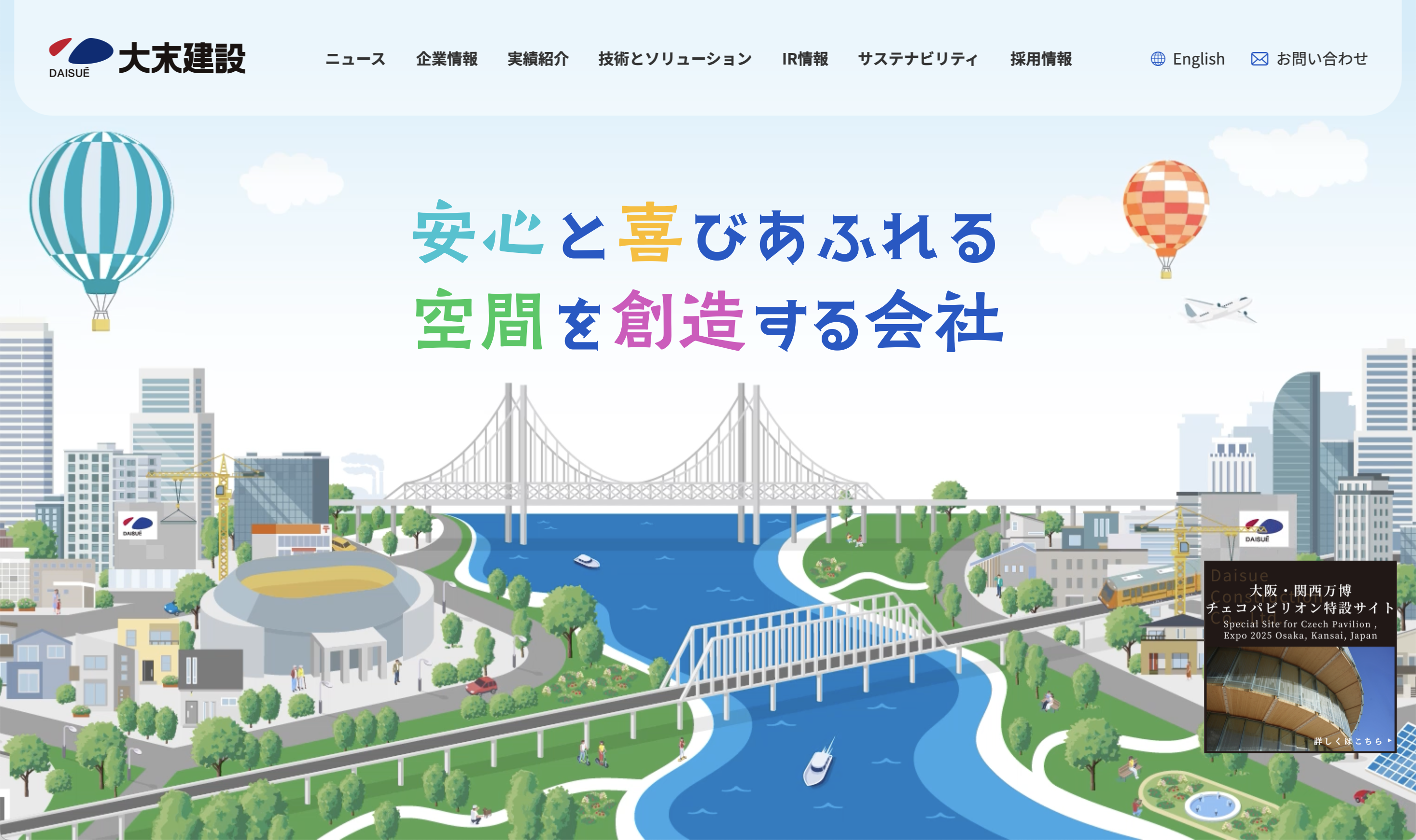 大阪市の大末建設株式会社は、マンション建設を中心として、大阪・関西万博のチェコパビリオンや、庁舎・オフィス、商業施設など、幅広く事業を展開する総合建設業者だ。