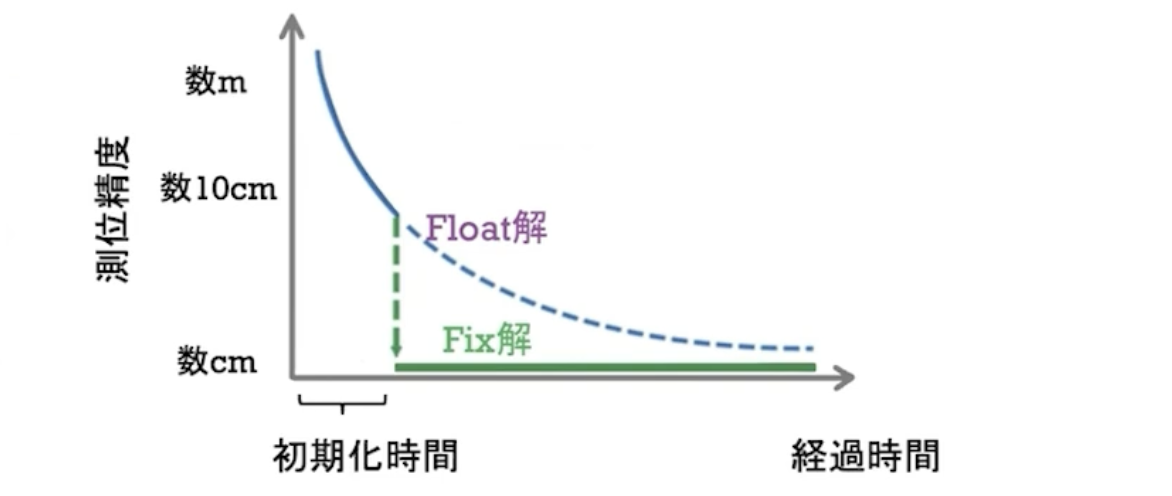 一方でFix解は、RTK測位において搬送波の波数が正しく確定した状態を指す。このとき、RTK測位は本来の精度を発揮する。