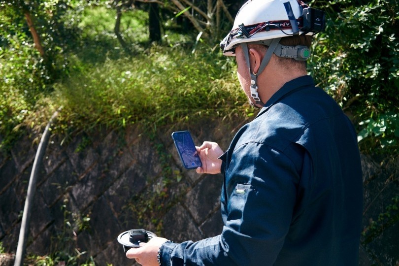 マルチバンド(2周波以上)の受信機を活用することでFIX時間が短縮されるということは前述したが、今、急速に土木や建設、インフラの現場で導入が進んでいるのが、3周波対応の高性能GNSSレシーバーとスマホを組み合わせたソリューション「OPTiM Geo Scan」だ。