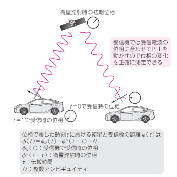 (画像元:トランジスタ技術2018年1月号 PDFより引用)搬送波の波長はL1帯で約19cmである。つまり、衛星と受信機の距離を測定するときに、「この距離には19cmの波がいくつ含まれているのか」という波数が、最初は不明なのだ。