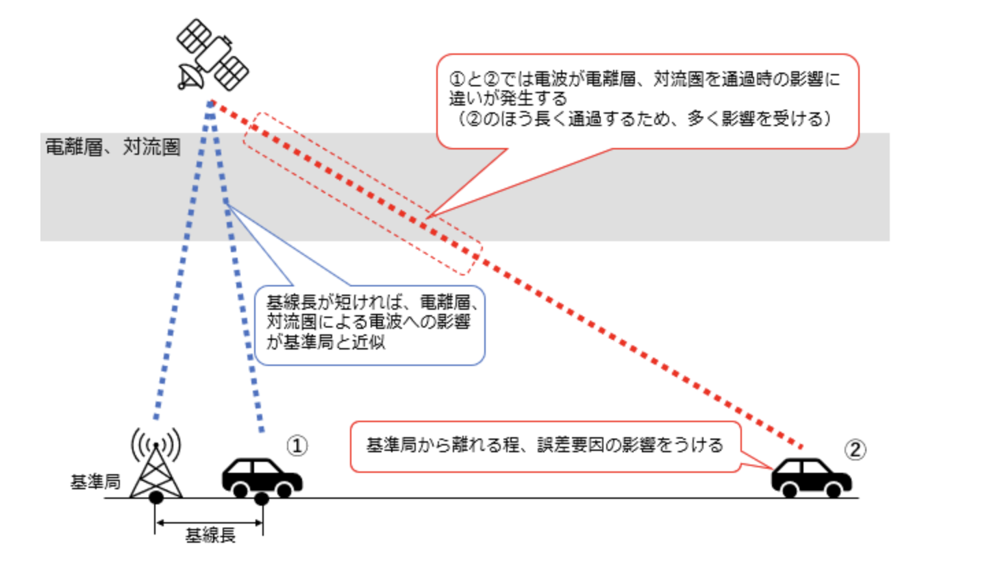 (画像元:株式会社ジェノバ「基線長が長いとどうなるか」WEBページより引用)RTK測位では、基準局と移動局の距離(基線長)が長くなるほど、Fix解を得るのが難しくなり、精度も劣化する傾向がある。