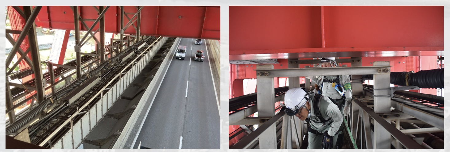 港大橋は中央径間510m、桁下空間51mのトラス橋で、検査路は車道直上に位置している。