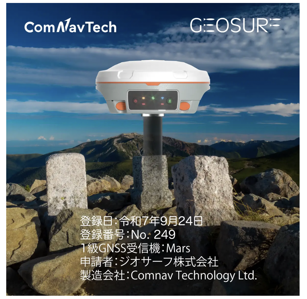 ジオサーフが取り扱うComNav Technology製GNSS受信機「Mars」が、国土地理院の測量機器性能基準に基づく検定・登録を経て1級GNSS測量機として正式に登録された。