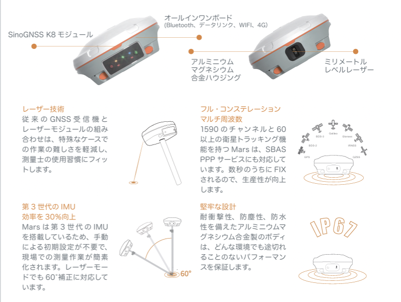 Marsは小型・軽量ながら高性能なGNSS測位機能を搭載した次世代型GNSS受信機である。