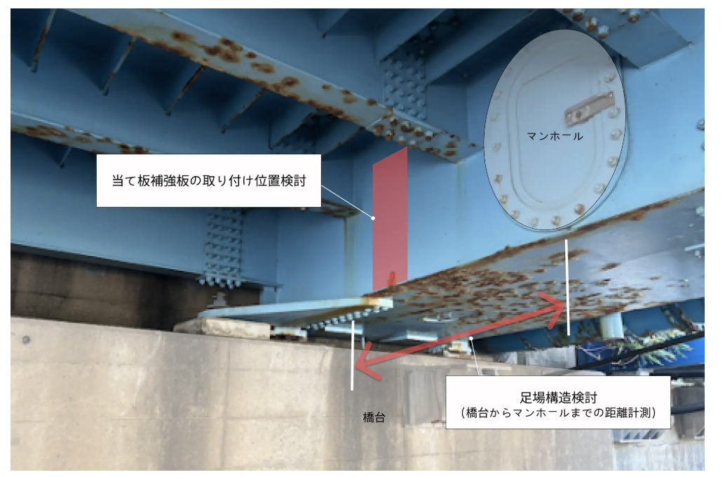〈鋼橋の保守・補修作業前の検討ポイント例(一部。画像は写真)〉