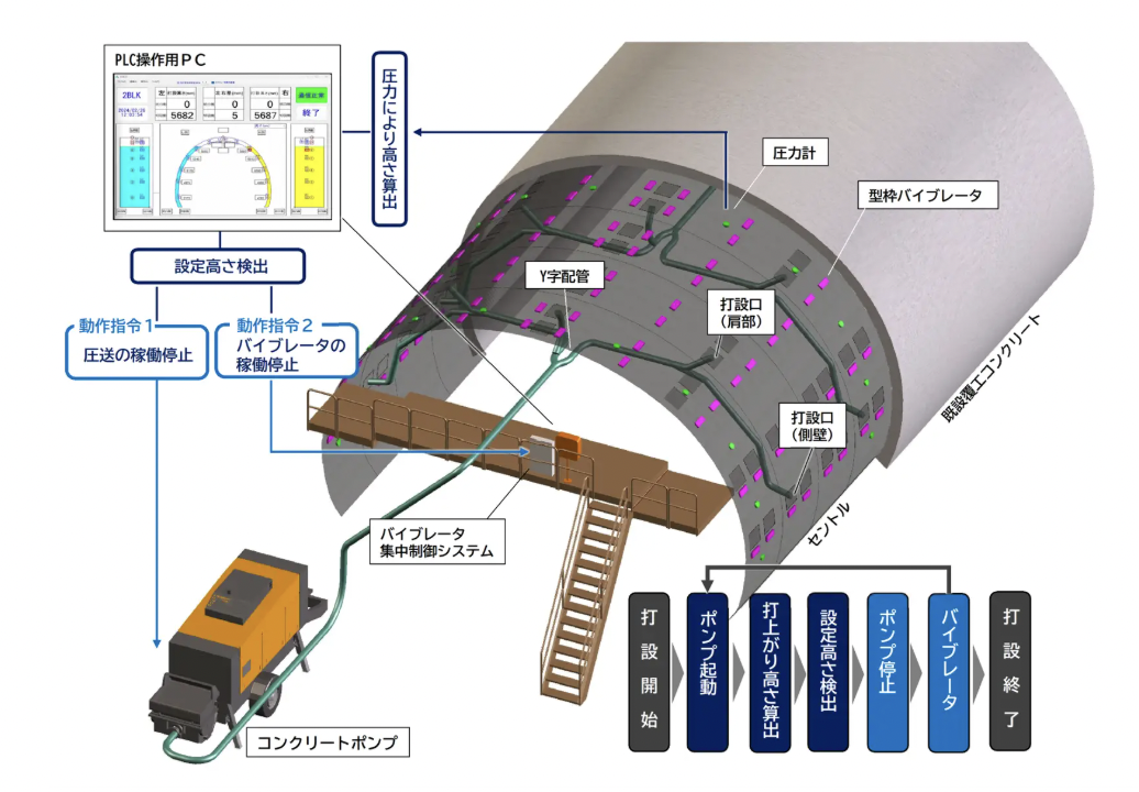 自動打設システムは、同社が開発した高速打設システムと圧力計による打設高さ検知システムを組み合わせ、これに圧送ポンプ機のリモコンとバイブレータの制御盤を連動させたものである。