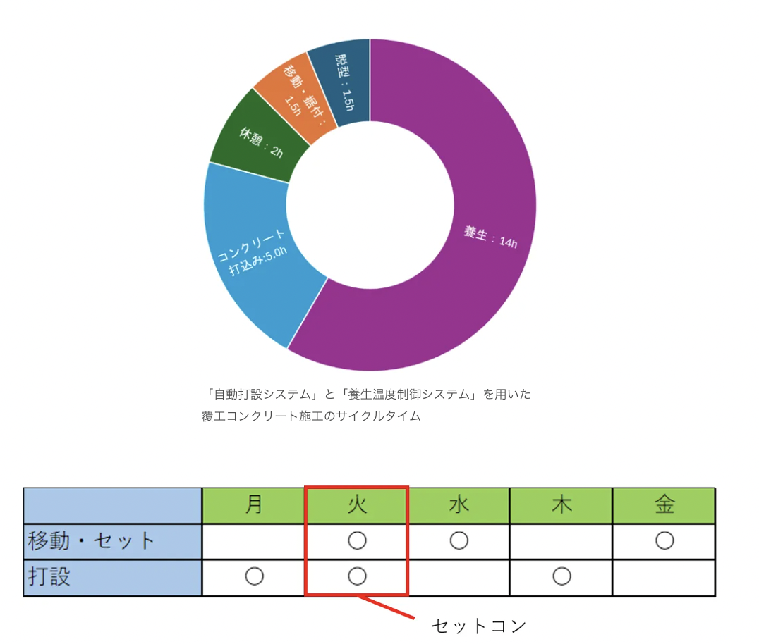 今回の施工では、セントルの脱型、移動、据付が約3時間、休憩が約2時間、コンクリートの打設作業が約5時間、翌日の脱型までのコンクリートの養生が約14時間で、合計1日24時間で実施した。