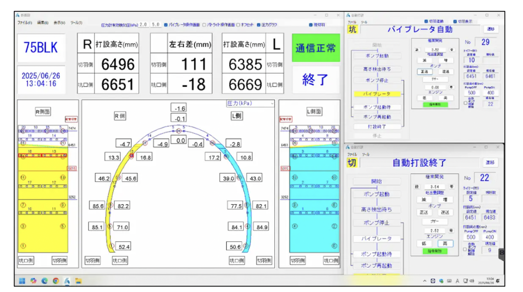 予め設定した打上がり高さに応じて、ポンプの圧送速度、ポンプとバイブレータの稼働・停止を自動制御することにより、覆工コンクリートの打設を、打設口の切り替え作業を除いて自動で行うことができ、技能労働者の省力化・省人化が図れる。
