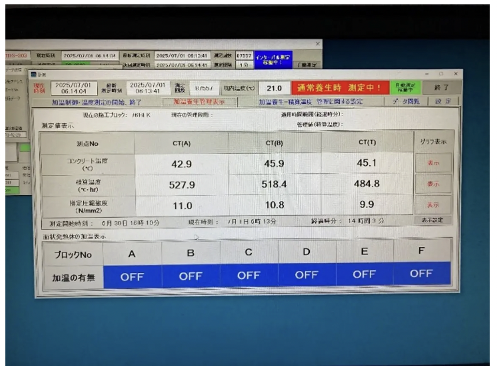 養生温度制御システムは、若材齢コンクリートである材齢1日程度の温度と強度発現の相関関係に基づきコンクリート温度を測定することで、養生からセントルを脱型するまでの圧縮強度をリアルタイムに算出するものである。