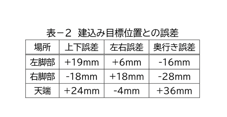 鋼製支保工の建込みと二次吹付け終了後、切羽の安全を確認したうえで鋼製支保工の位置を計測して目標位置との誤差を確認した結果、従来の方法による建込み精度は一般的にプラスマイナス50ミリメートル程度と言われており、今回の施工では最大誤差が36ミリメートルであったため、従来の方法と同等以上の精度で建て込めたことを確認できた。