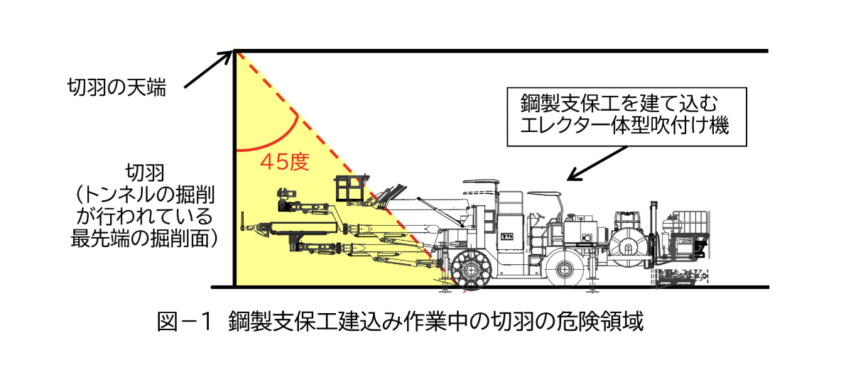 切羽へ立ち入る前に一次吹付けや鏡吹付けを行い、天端からの崩落や切羽からの肌落ちがないかを切羽監視責任者が監視しながらの作業となるが、脆弱な地山では吹付け直後のコンクリートが地山もろとも急に落下し、切羽監視責任者による退避指示が間に合わずに作業員へ衝突し、被災する懸念がある。