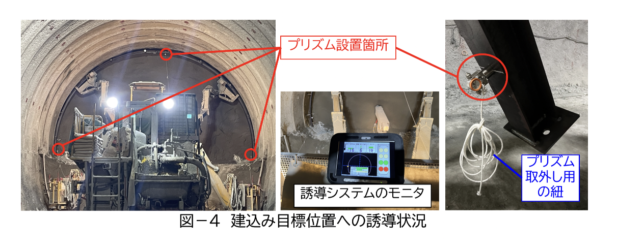 今回の試験施工では、切羽後方に設置したトータルステーションと、鋼製支保工の左右脚部と天端の計3箇所に設置したマグネット式の特殊プリズムにより座標を確認しながら、頭付きアンカーが設置された状態の鋼製支保工を目標位置へ誘導を行った。