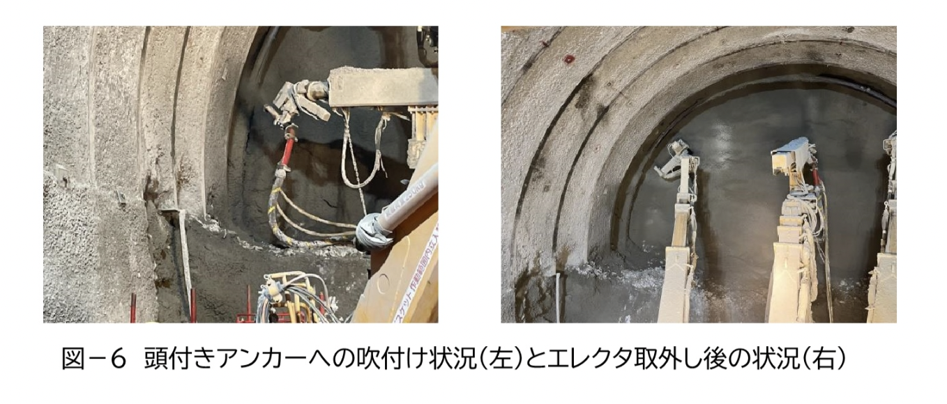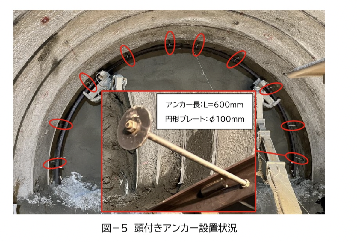 これを解消するため、つなぎ材の代わりに頭付きアンカーを建込み前の鋼製支保工へ事前に設置しておき、エレクタで鋼製支保工を把持したまま頭付きアンカーを吹付けコンクリートに埋め込み、固定を確認してからエレクタを取り外すことで、切羽直下でのつなぎ材設置作業を省略する。
