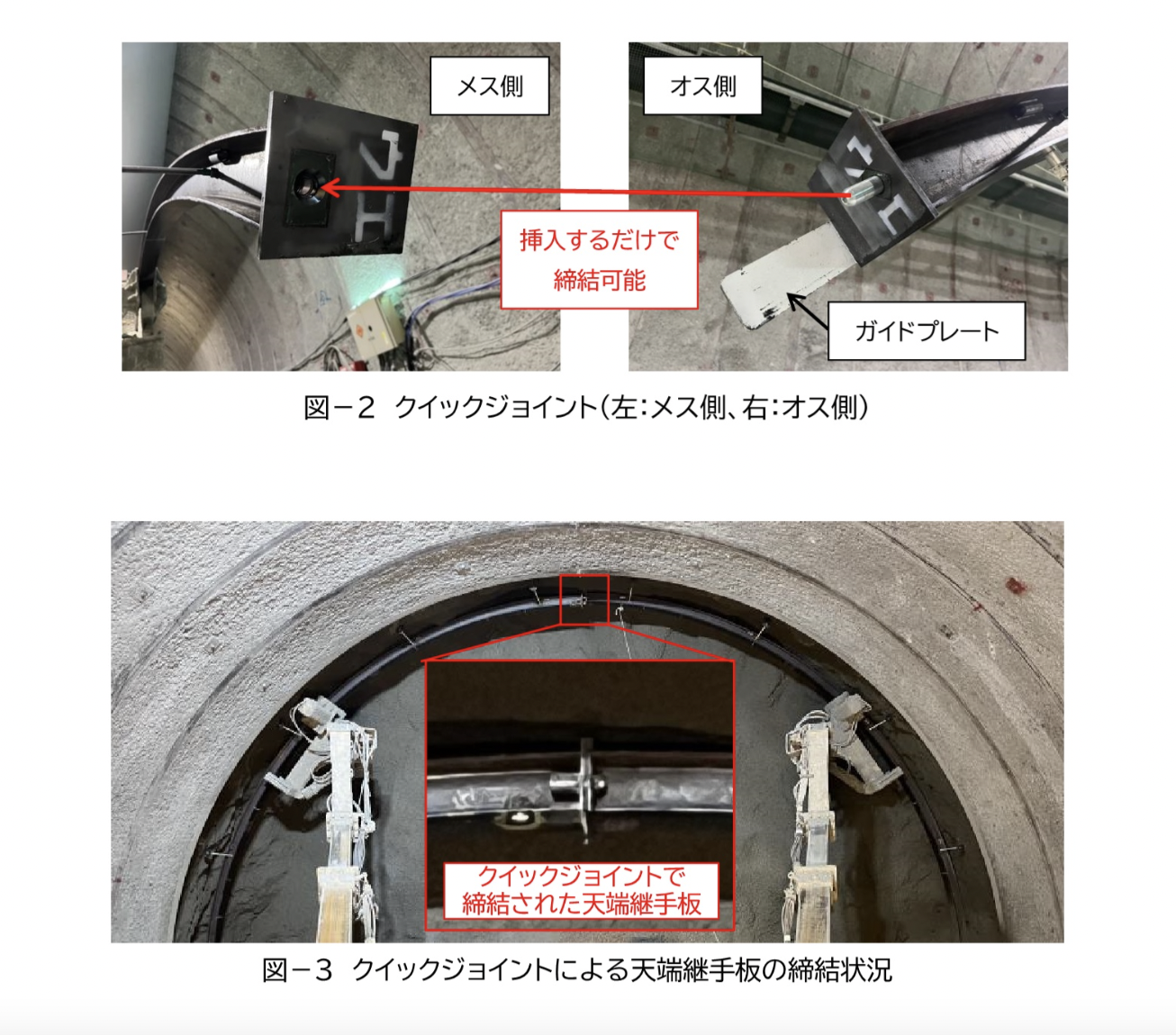 標準的な鋼製支保工の天端継手部は、左右の継手板を切羽直下で作業員がボルト・ナットにより締結するが、クイックジョイントは、メス側とオス側の治具を事前に継手板へ固定し、エレクタ操作のみで締結可能な構造となっている。