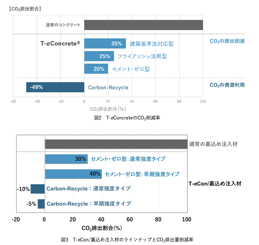 同社は、T-eConcreteの「セメント・ゼロ型」と「Carbon-Recycle」の二技術をA液へ応用し、「Carbon-Recycle」では材料製造時のCO2排出量の実質マイナスを実現する「T-eCon/裏込め注入材」を開発した。