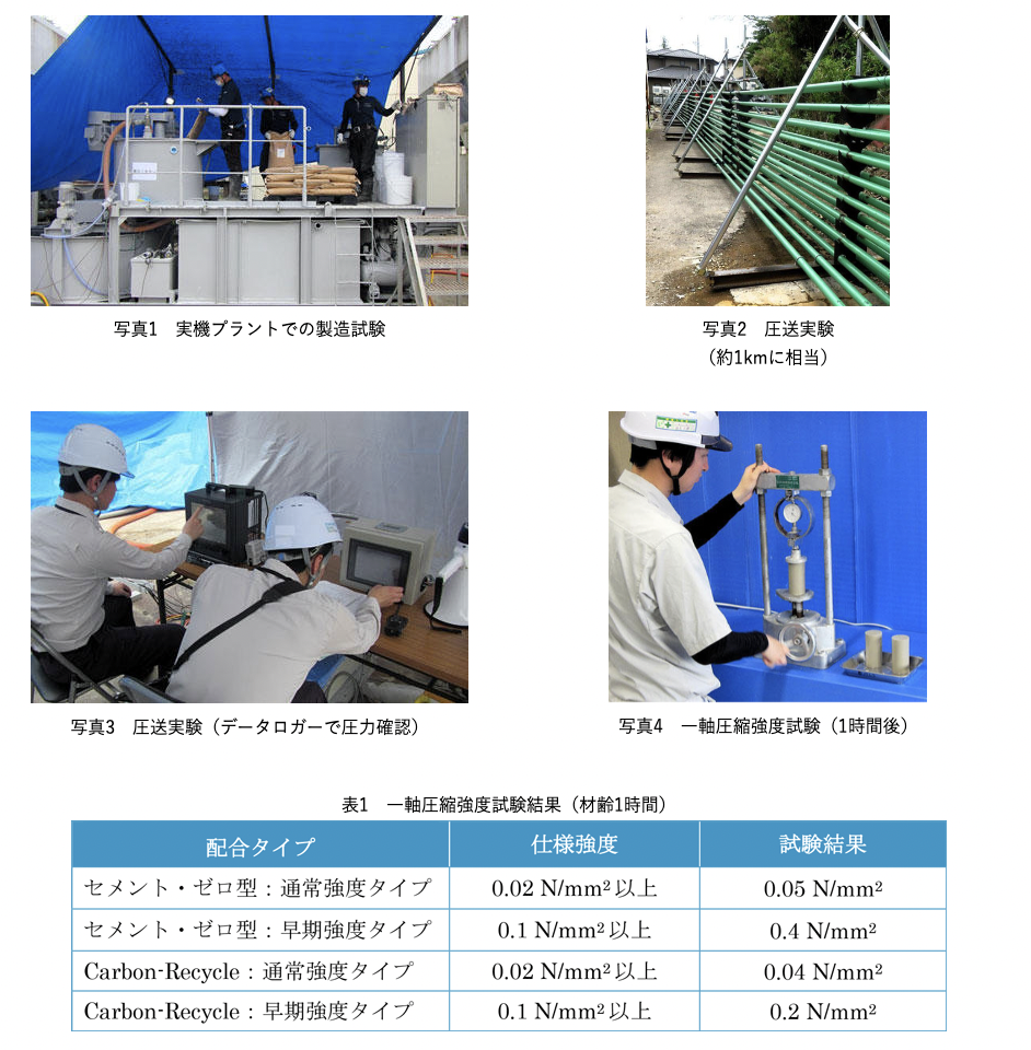 T-eCon/裏込め注入材は、実機プラントでの製造試験や延長約1キロメートルに相当する圧送実験、注入1時間後の一軸圧縮強度試験などにより、製造効率やポンプ圧送性、A液とB液混合後の性能などが従来の裏込め注入材と同等であることを確認済みである。