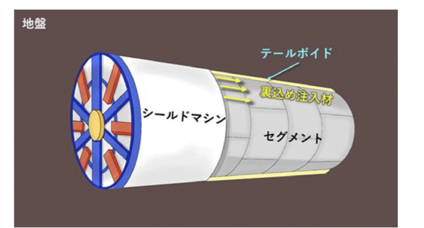 シールドトンネル工事では、掘進時にセグメント外周と地山の間に生じるテールボイドに裏込め注入材を充填し、周辺地盤の沈下抑制とトンネル構造の安定を確保する。