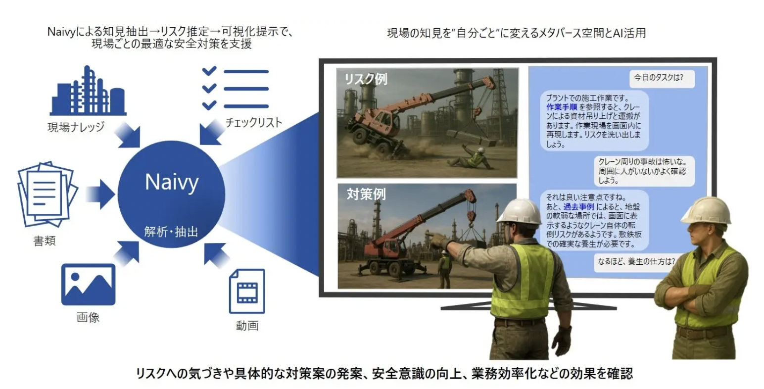 メタバース空間で現場をリアルに再現し、中核を担うNaivyが過去の類似事例を即時に解析・抽出することで、安全手順の確認や危険個所の可視化にとどまらず、現場ごとの潜在リスクや最適な安全対策も作業者にわかりやすく可視化する。
