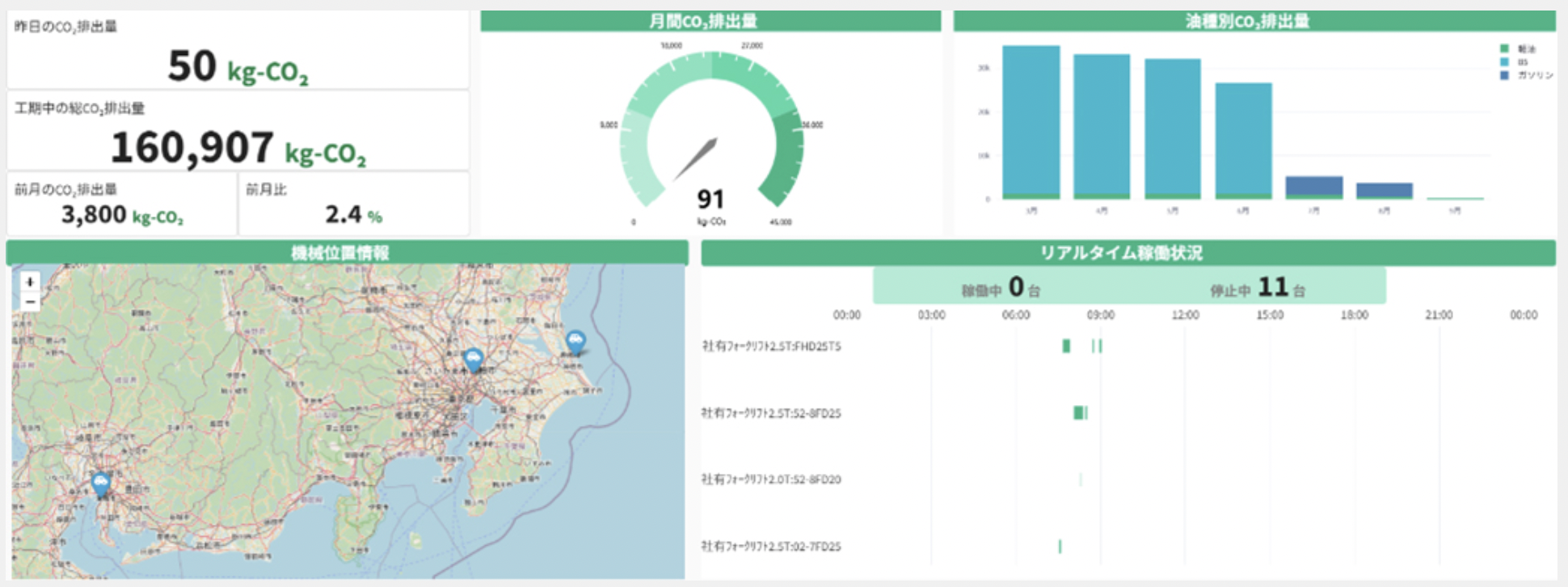 燃費や稼働時間などのデータをもとに、現場ごとのCO2排出量を自動計算することで、報告書作成の効率化に加え、環境対策の基礎データとしても活用可能だ。