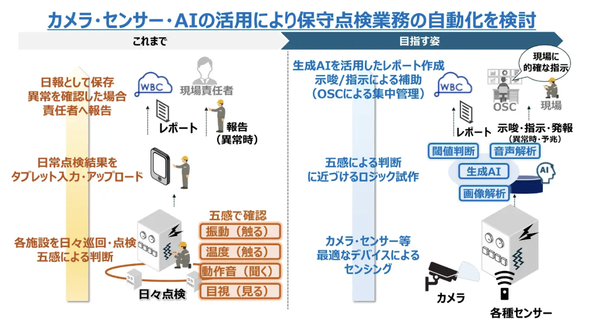 現場作業員が実施している機器や設備の確認から判断、記録に至る保守点検業務の一連のオペレーションを、情報通信ネットワークを基盤として、ネットワークカメラやIoTセンサーによるセンシング、また生成AIの活用により、人手を介すことなく成立させることができるソリューションの開発と検証を実施する。
