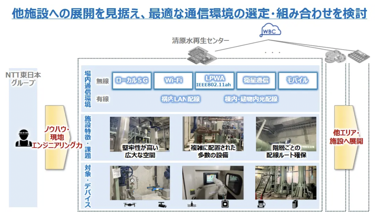 NTTグループが提供する多様なネットワークラインアップとノウハウ、および現地の通信環境の構築で培ったエンジニアリング力と、メタウォーター独自の情報通信プラットフォーム「WBC」、および「オペレーションサポートセンター」を連携させることにより、保守点検業務の自動化の基盤となる、上下水道施設における最適な情報通信ネットワークの構築を目指す。