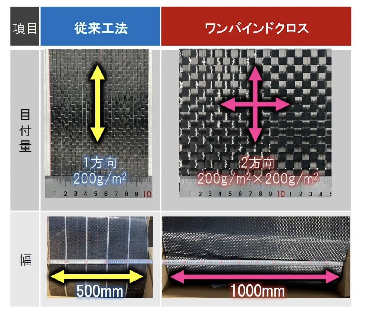 トンネル覆工補強工事で使用される従来のシートは、1方向に引きそろえられ200グラム毎平方メートルの目付量だが、ワンバインドクロスで使用されるシートは、2方向それぞれに200グラム毎平方メートルの目付量で、1層で従来の2層貼り付けと同等の補強効果を確保している。