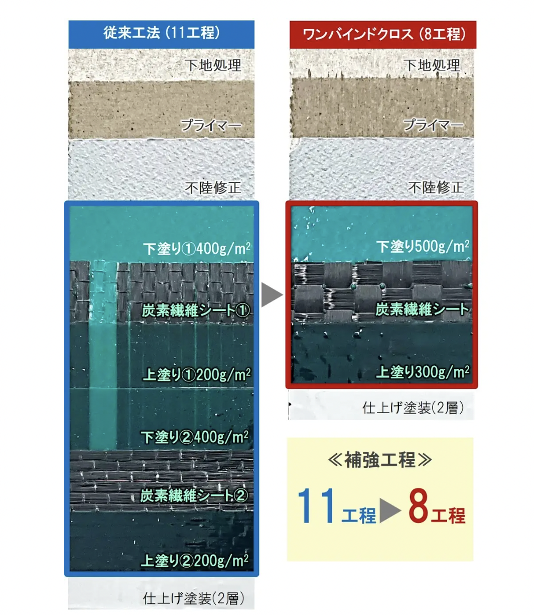 ワンバインドクロスにより、トンネル覆工補強工事におけるシートの貼り付け作業は従来の2層貼り付けから1層に半減し、従来工法の11工程から8工程に短縮される。
