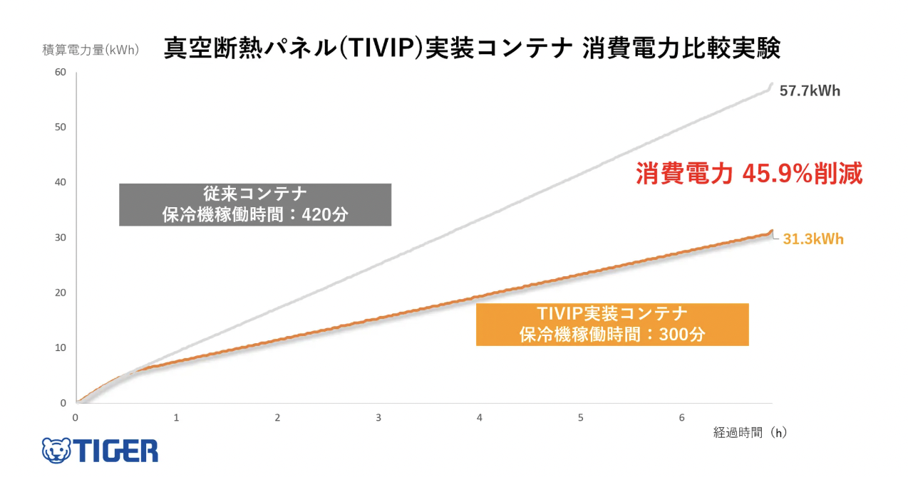 タイガー魔法瓶は、独自開発の「ステンレス密封真空断熱パネル TIVIP」を搭載したリーファーコンテナの実証実験を行い、消費電力およびCO2排出量を45.9%削減することに成功した。