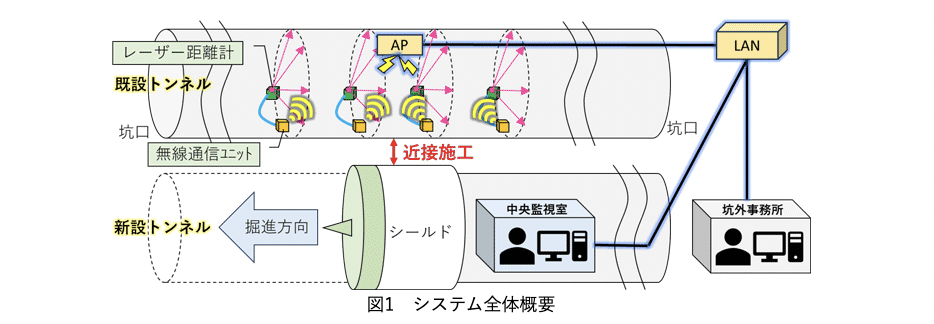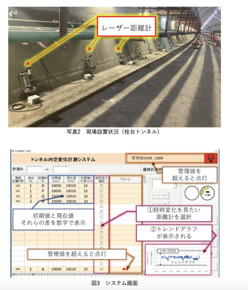 しかしトンネルのカーブ区間や支障物、車両の往来などにより計測範囲が制限される上、計測作業や計測機器の盛り替えに人手が必要であり、さらに計測データのリアルタイムでの入手や経時変化の把握が困難であるなどの課題があった。