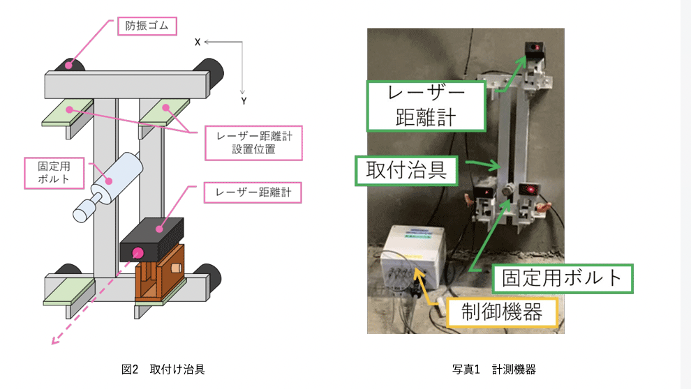本システムの計測機器はアルミ製で重さ2キログラムと軽量な専用取り付け治具を用いてボルト1点留めにより簡易にトンネル壁面に固定できる。